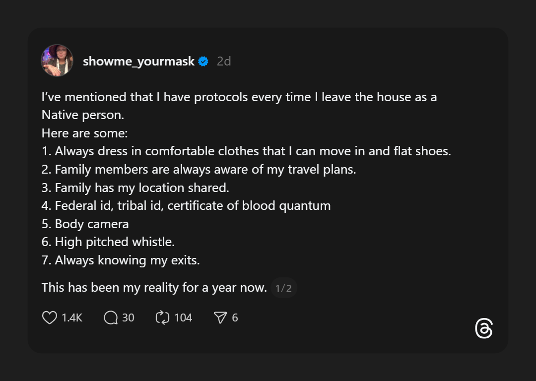The posts have created a space for folks in the Native community to lean on each other about the weight of just trying to survive. I am privileged to have extensive documentation proving my Tribal identity, many may not have recourses or access to acquire a current Tribal ID, or may have experienced disenrollment, either way there is a lot of anxiety.